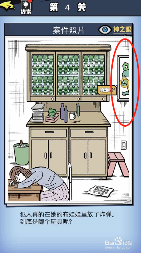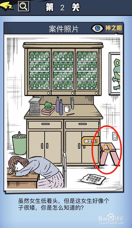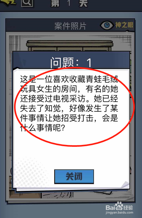 第一案的本家儿人公是一位女生,页面展示的也是一个喜好收集青蛙毛绒玩具的女生的房间,这个女生今朝已经掉去了知觉,而且仿佛蒙受了冲击。问题1让我们找出冲击她的是什么工作。