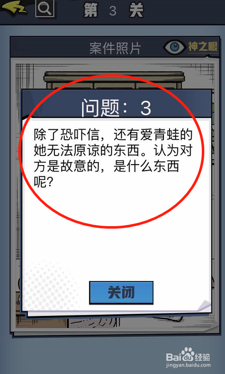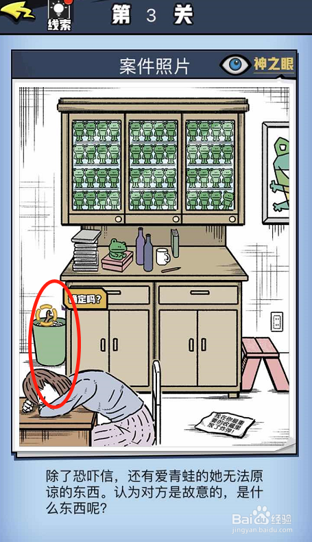让喜好青蛙的女生无法原谅的工作必定是和青蛙有关的话,更可能是会对青蛙造当作危险的工具,所以我们要找的就是桌子的左侧的垃圾桶内的蛇,这是青蛙很是害怕的。