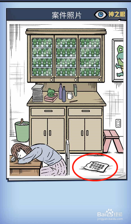 要找的青蛙就是页面最右侧的青蛙的画像,因为从相框下面的暗影就可以看出这个相框是歪的,正常的话是不会歪的,所以监犯是将工具藏在了这里。