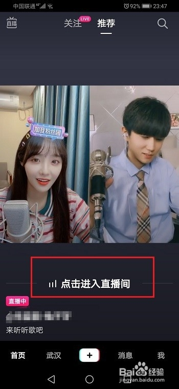 第二步下面我们来看一下怎么插手粉丝团,打开抖音,点击进去直播间,如下图所示: