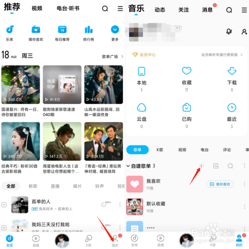 登录后,在首页下方找到“我的”,点击进入我的页面。想要上传歌单首先您必定先要有一张歌单,在自建歌单旁有个加号图标,点击进行歌单新建,如下图。