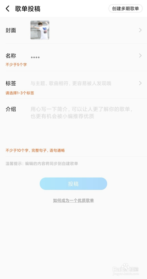 添加完歌曲今后,我们退回到歌单界面,在右上角找到“投稿”,点击之后来到下图所示页面,按图上要求完当作信息填写(事先已填写完这些信息的伴侣,直接投稿即可)。