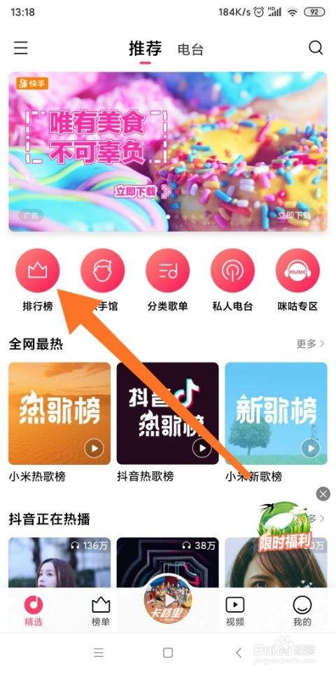 2.如图所示,进入到这个音乐软件界面之后,我们点击箭头所指的“排行榜”按钮。