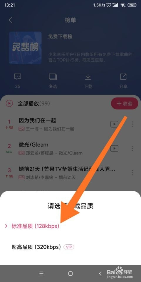 8.如图所示,在弹出的对话框中,我们点击箭头所指的“尺度品质(128kbps)”选项,就可以选择这个品质的音乐进行下载了。