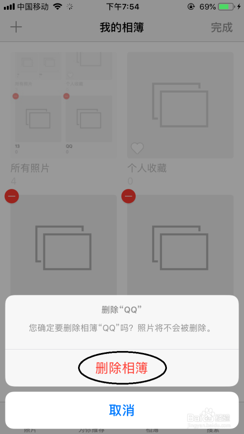 然后再弹出一个小提醒对话框中选项下点击“删除相簿”。