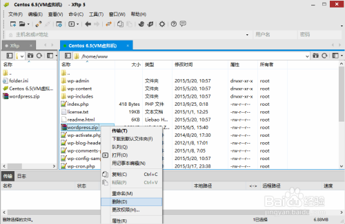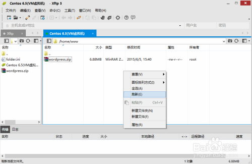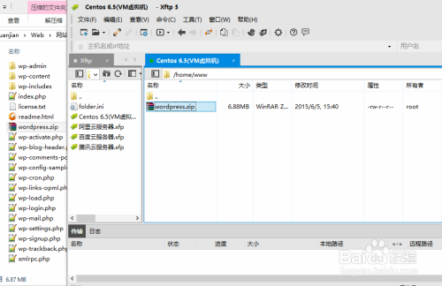 上传单个文件:好比要把wordpress.zip文件上传到/home/www目次下,打开Xftp,把wordpress.zip文件拖动到Xftp对应的目次窗口中,