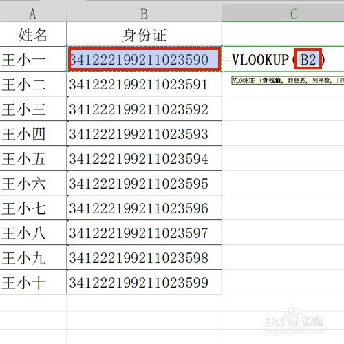 然后点击要比对的数据,此时函数为=VLOOKUP(B2,),如图所示。
