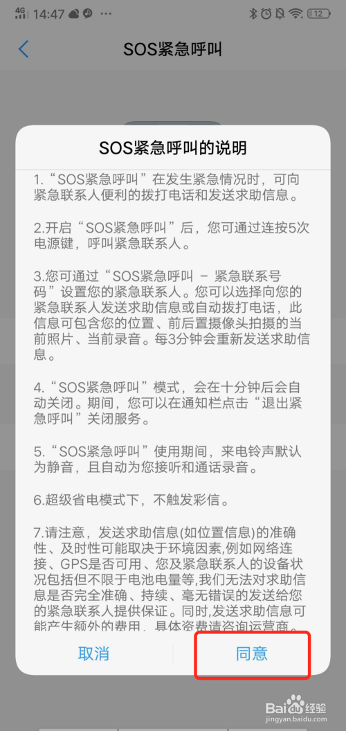 5、点击【赞成】开通【SOS告急呼叫】功能。