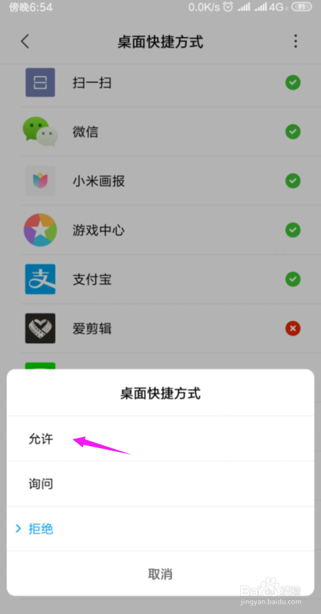 【桌面快捷体例】中,打【√】的是已经开启了的,打【×】的是没开启的,我们点开要开启的一个软件,如图。