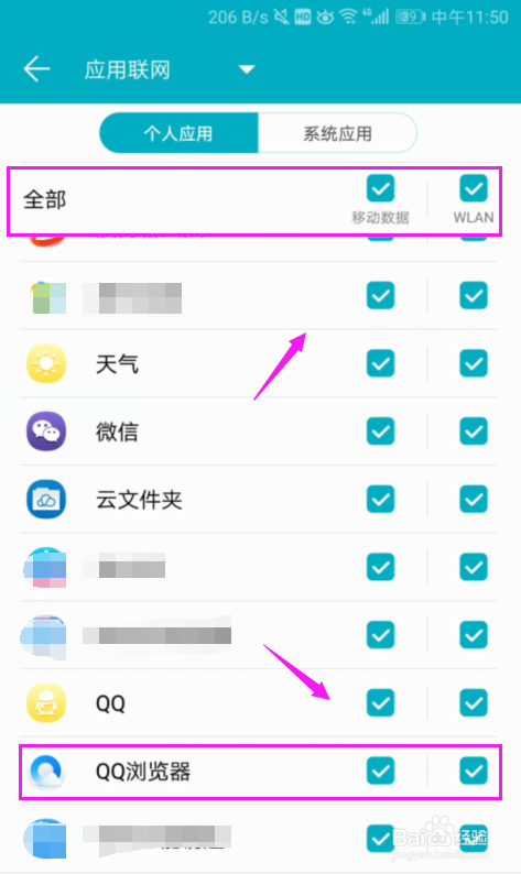 在这儿我们就看到QQ浏览器是没有被运行利用流量和wifi的,如图。