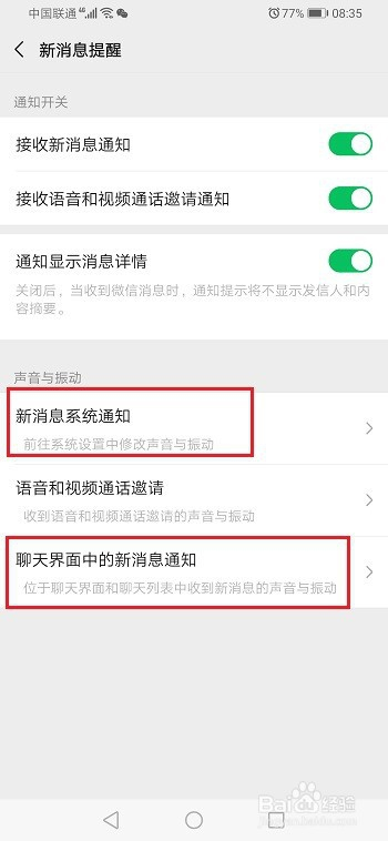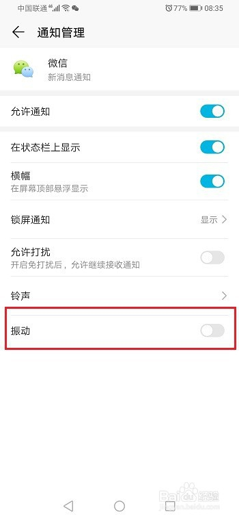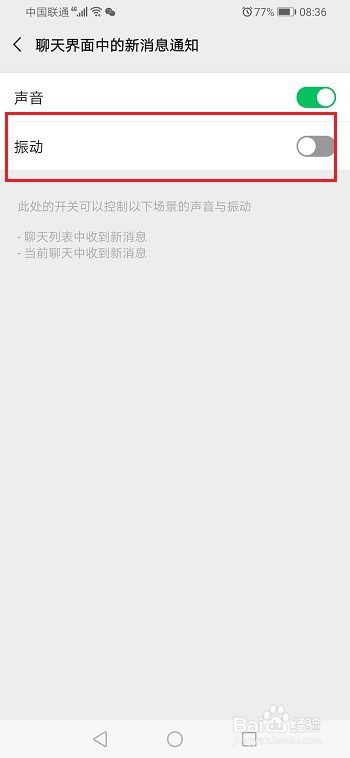 第五步进去聊天界面中的新动静通知界面,封闭振动,就当作功封闭了华为手机微信动静振动了,如下图所示: