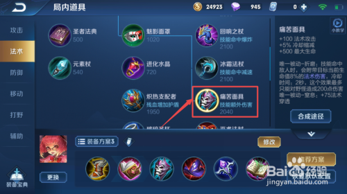 之后我们该出疾苦面具,这个装备的优势在于削减冷却时候,因为安其拉的技术算是比力强势的,而冷却时候却制约着安其拉的技术输出,所以,疾苦面具在第三件装备出是比力合适的,并且可以加血。