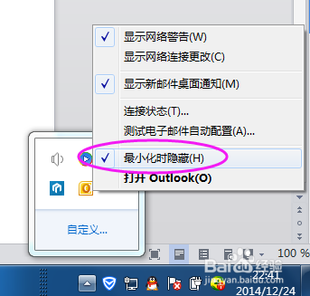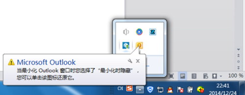 打开outlook2010软件之后,右下角会有outlook托盘图标。如图默认【最小化时埋没】没有勾选