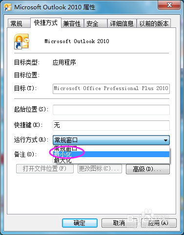 打开outlook 2010属性之后,把运行体例选择【最小化】
