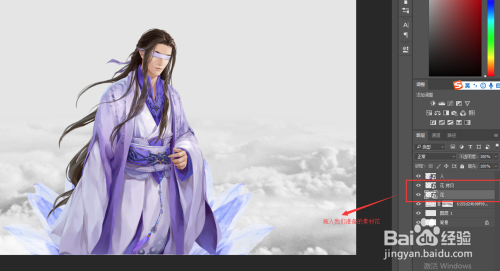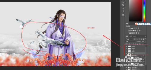 拖入我们的花素材,将其放在人物下方的左侧,调整到合适位置,然后按键盘上Ctrl+J复制花素材图层得到拷贝层,选中拷贝层,Ctrl+T自由变换,右键选择水平翻转,然后将拷贝花图层移动人物下方的右侧,再次选中花图层与拷贝层,将其移到人物层的下方。