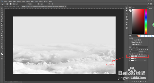 拖入我们提前找好的云彩素材,将其放到画布中合适的位置,然后双击确定,在选中云彩素材图层,右键选择栅格化图层将其变成正常图层,然后选择菜单栏图像——调整——去色,将其转成黑白图像,然后给其添加图层蒙版,在蒙版中用黑色画笔进行适当的擦拭。