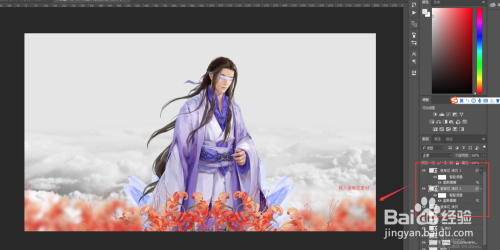 拖入彼岸花素材,同样按Ctrl+J复制三次,得到三个拷贝层共四个彼岸花图层,将彼岸花和拷贝1图层按照上一步操作分别放在人物下方的左侧和右侧并对齐,拷贝层2和拷贝层3移动到画布的两边,调整到合适位置,然后执行滤镜——模糊——高斯模糊,设置适当的模糊数值使其模糊。达到一种层次关系。
