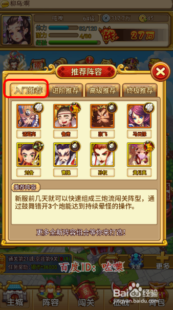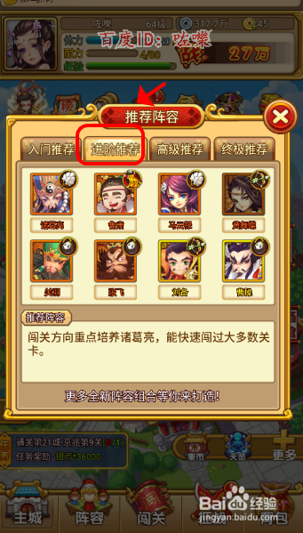 然后可以查看系统的武将保举组合,初级,满是金色以下的组合