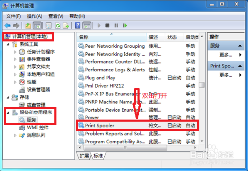 点击后会进入到计较机办理界面,在左边依次点击【计较机办理】—>【办事和应用程序】—>【办事】,接着在右边找到【print spooler 】并用鼠标双击。