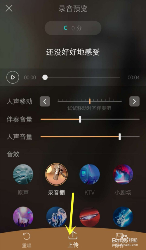 演唱的歌曲合成之后,你可以进行试听或重唱。确认过之后,点击下方的“上传”就可以了。