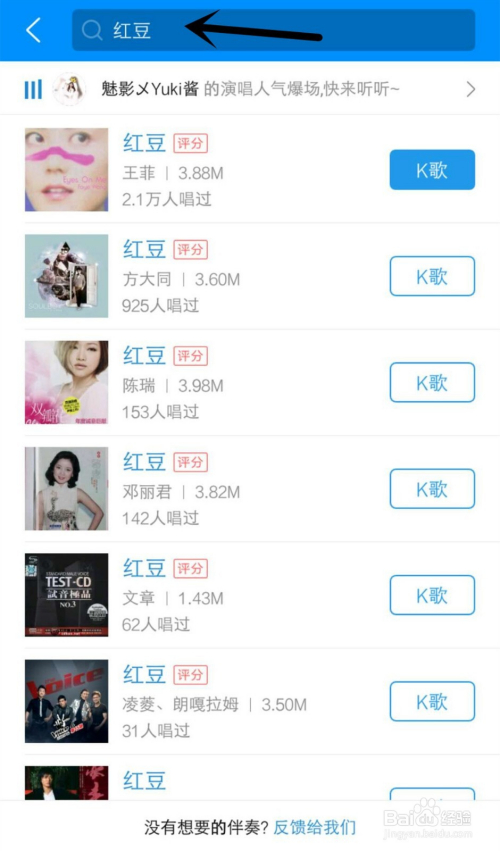 在搜索结果里选择那首歌的版本。找到之后,点击歌名后边的“K歌”。