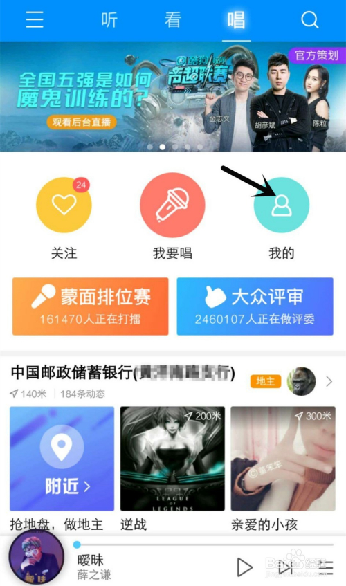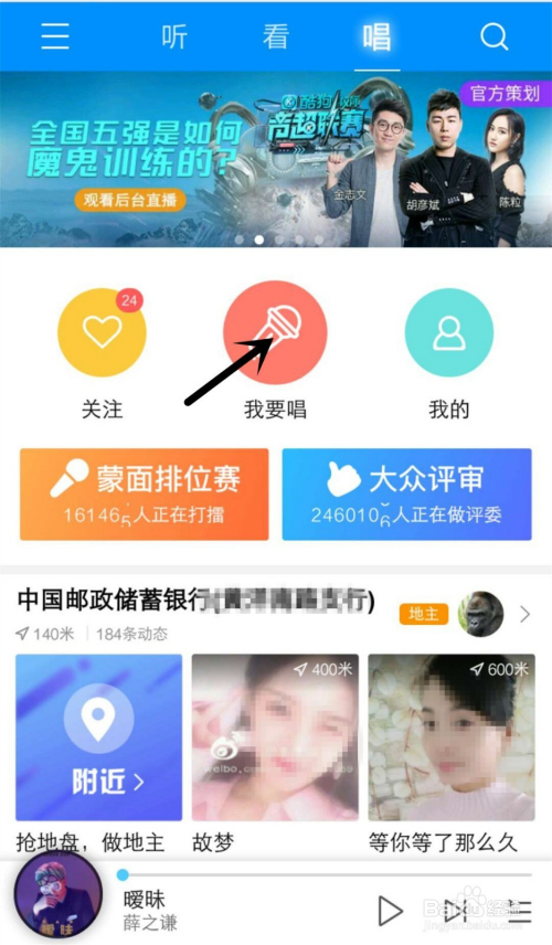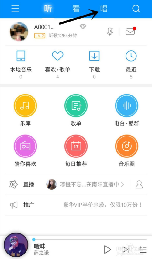 打开酷狗,进行登录。点击上边蓝色栏里的“唱”。
