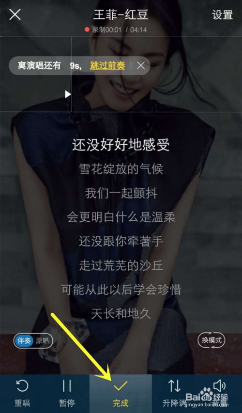 这样就可以跟着歌曲伴奏,开始演唱了。可以切换各种模式,也可以开启原唱。演唱结束,点下方的“完成”。