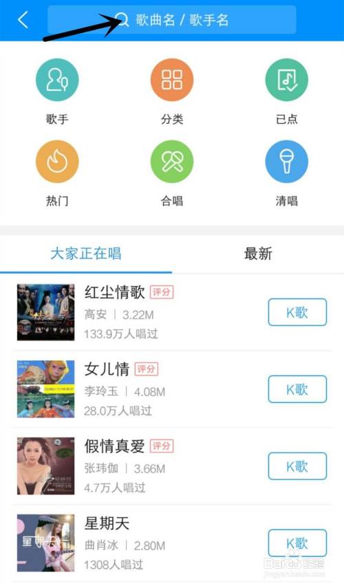 上边蓝色区域里,输入自己要唱的歌名。并点击搜索。