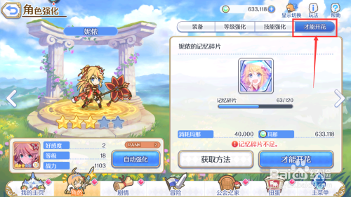 最后,我们来到脚色的“才能开花”界面,利用足够数目的记忆碎片可以对脚色进行才能开花,才能开花后的脚色会晋升属性。
