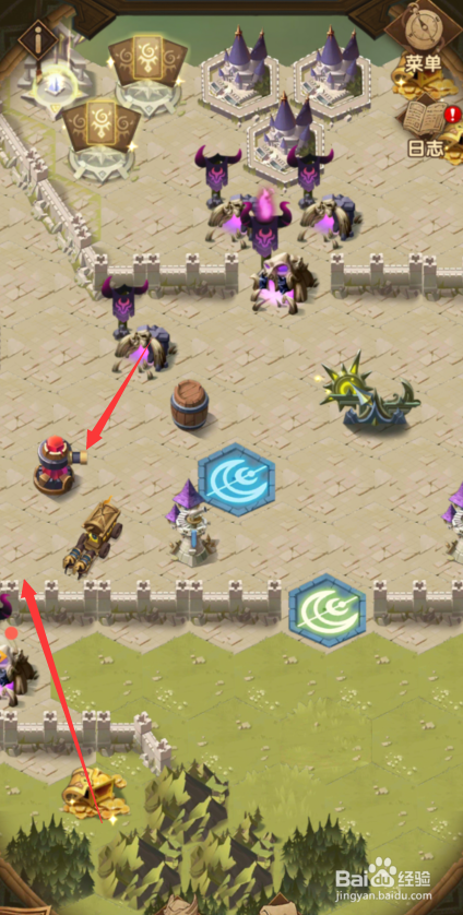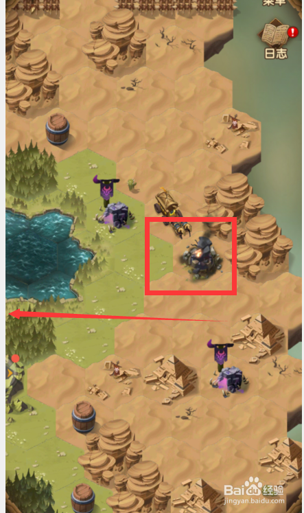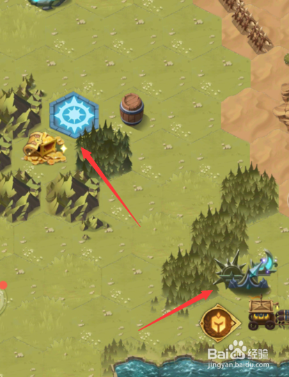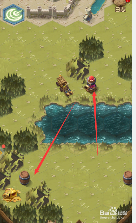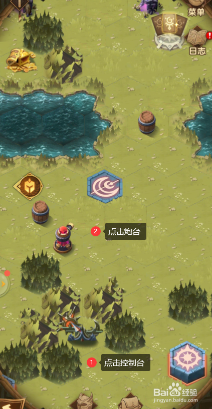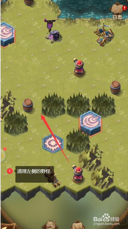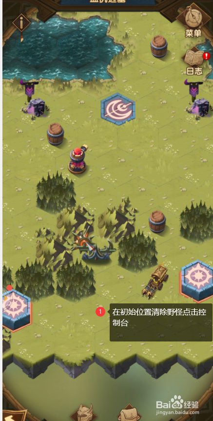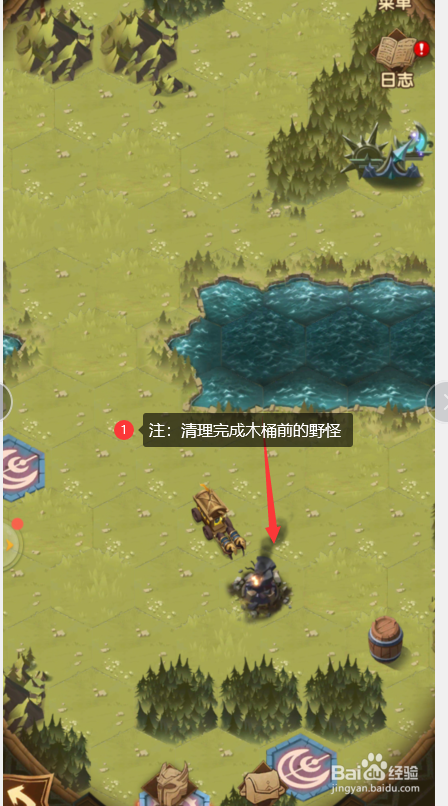 清理左侧的野怪然后点击【第一个炮台】击碎木桶。