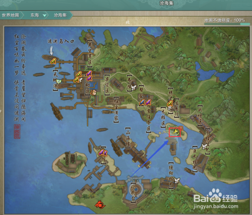 来到侠客岛后,大轻功飞到木桩区小岛的红框处。