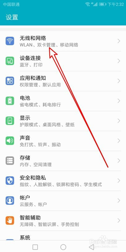 接下来再打开的设置页面,点击无线和收集的菜单。