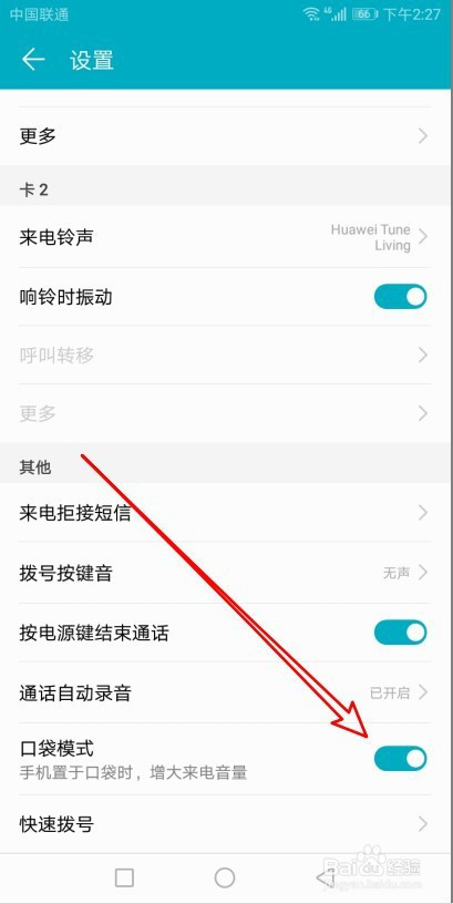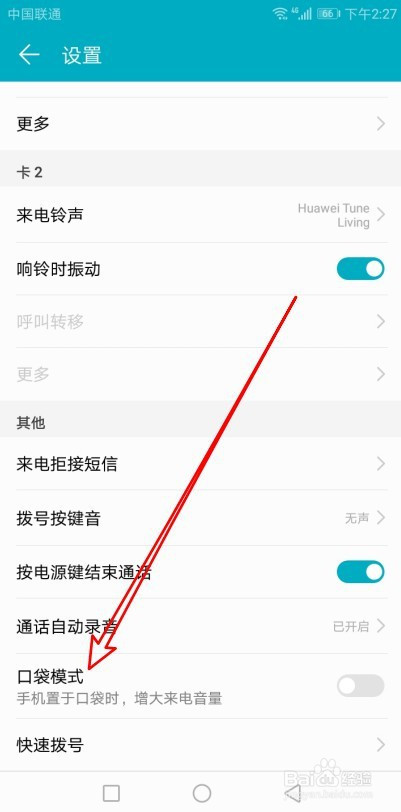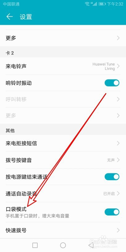 接着在打开的拨号设置页面,找到口袋模式的设置项。