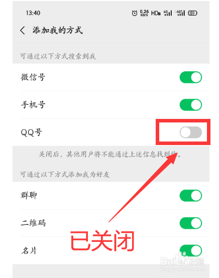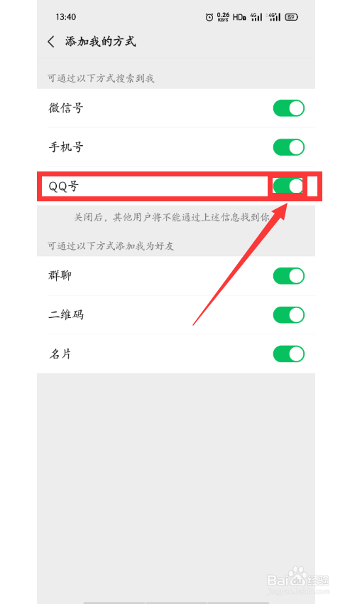 第五步:点击【QQ号】右侧的开关头,将其封闭