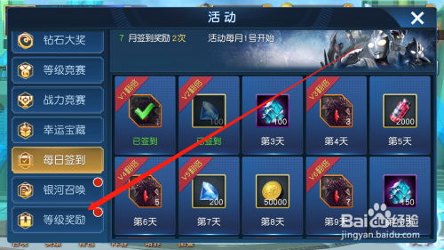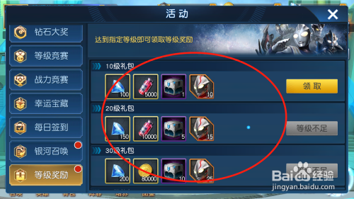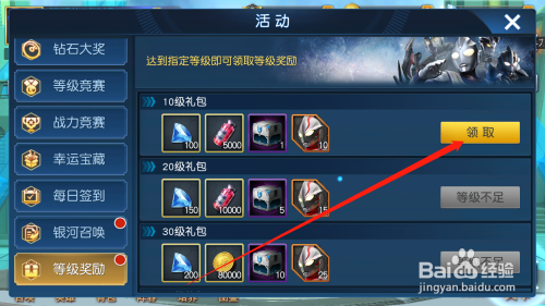 工具/原料奥特曼王者传奇方式/步骤1点击进入游戏2点击活动按钮,打开活动列表3点击品级奖励按钮,进入活动4可以看到当前可以领取的奖励,以及后续奖励的领取前提5点击领取按钮,就可以获得对应的奖励6点击封闭按钮,就可以利用奖励更好的进行游戏了