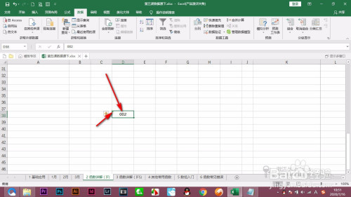 6.我们在设置好格局的单位格中输入002,在默认环境下之会显示0,可是因为它是文本格局,会保留零,在左上角的位置呈现一个绿三角显示。