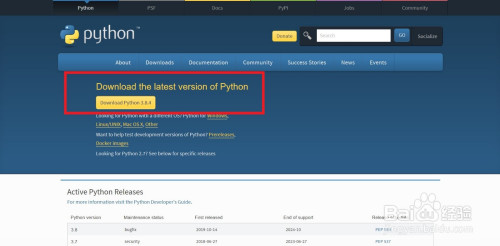 第一步,找到python官网,选择“Download Python 3.8.4”最新版,您也可以选择“Downloads”中的往期版本。