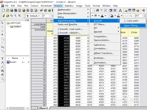 想要对数据进行光滑处置,则选中要处置的数据,依次操作:Analysis→Signal Processing→Smoothing→Open Dialog...;