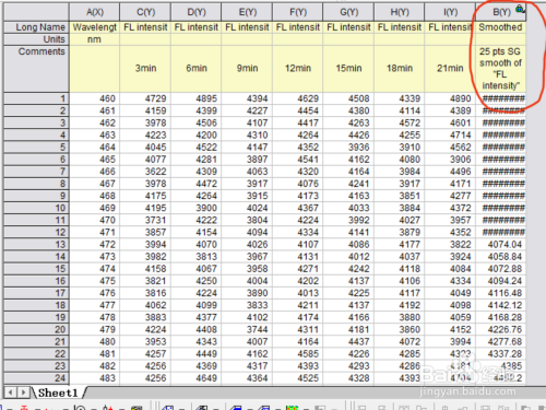 在本例中,我们将Points of Window的个数更改为25,Polynomial Order的阶数默认为2连结不变,单击OK,回到本家儿页面,即可看到呈现了一列新的数据,该列数据即为所选数据光滑后的数值;