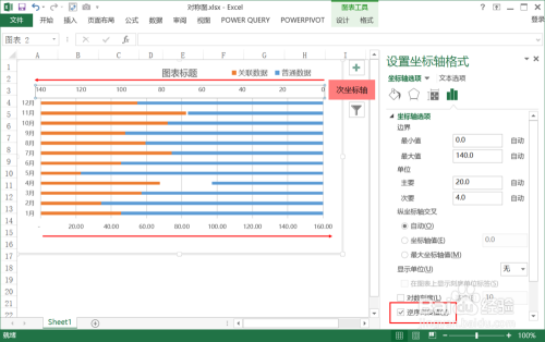 - 在“本家儿坐标轴”或“次坐标轴”之一的选项中设置“逆序刻度值”。