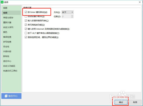 勾选【按Enter键后移动】勾选项,再点击【确定】