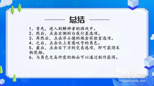 工具/原料演示手机:黑鲨3;游戏版本:3.0;方式/步骤1首先,进入到解神者的游戏中。2然后,点击右侧的白夜行星选项。3再然后,点击浮士德的炼金尝试室选项。4之后,点击头上有感慨号的脚色。5最后,点击右下方的买卖选项,即可获得采购奖励。6与脚色买卖所需的物品可以经由过程建造获得。总结11、首先,进入到解神者的游戏中。2、然后,点击右侧的白夜行星选项。3、再然后,点击浮士德的炼金尝试室选项。4、之后,点击头上有感慨号的脚色。5、最后,点击右下方的买卖选项,即可获得采购奖励。6、与脚色买卖所需的物品可以经由过程建造获得。