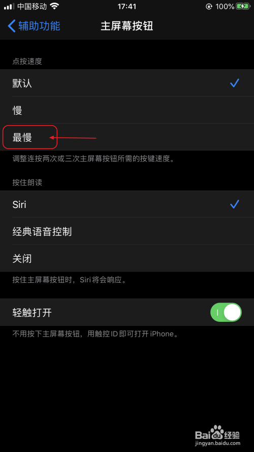 苹果手机:打开设置-辅助功能-本家儿屏幕按钮-将速度更改为最慢。