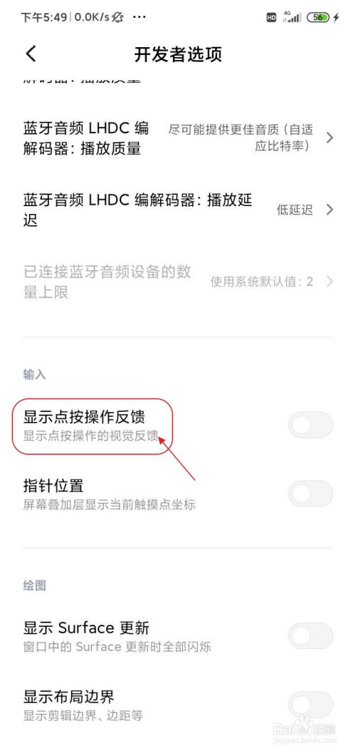 安卓手机:进入开辟者模式,找到显示点按操作反馈并打开。