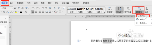 2.在文档中找到一处需要查找的文字,然后选中,之后选择菜单栏中的“起头”,选择“查找替代”,选择“查找”;