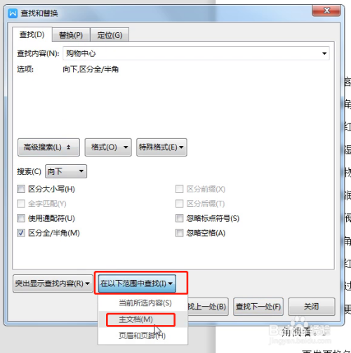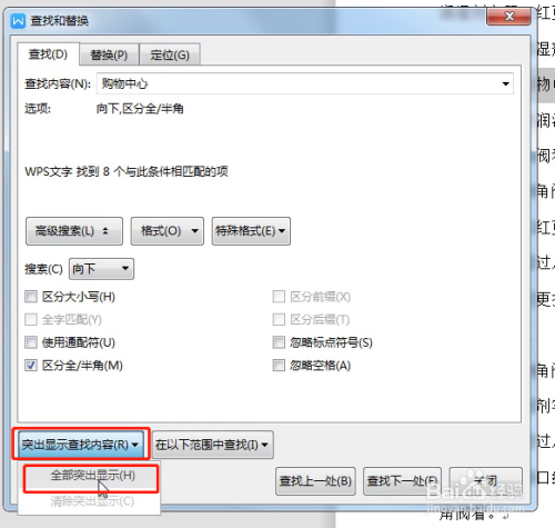 3.打开的“查找和替代”对话框中,点击“在以下规模中查找”的下拉框,选择“本家儿文档”,然后点击“凸起显示查找内容”的下拉框,选择“全数凸起显示”;