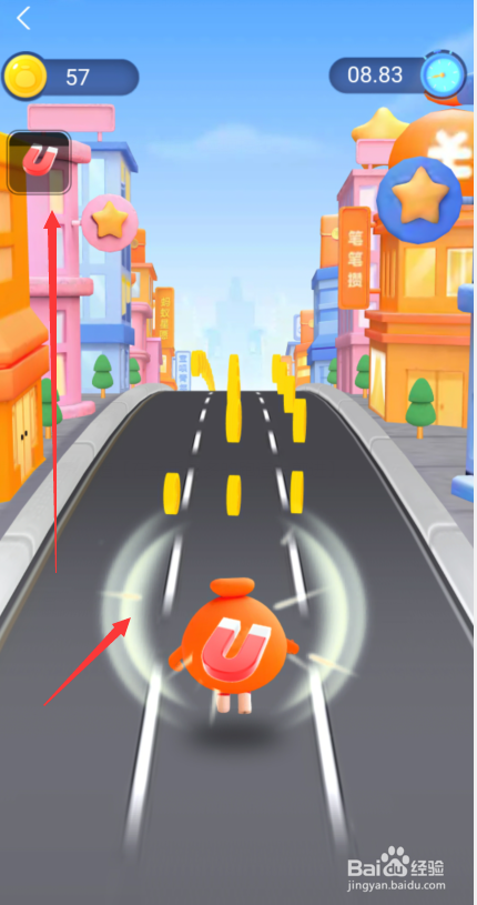 碰到【吸铁石】的标记点击领取【可以快速吸收金币】。