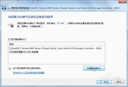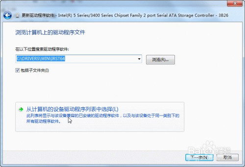 然后找到您硬盘的目次,加载响应的sata驱动。这里,就选适才记下的硬件型号“Intel(R) 5Series/3400……”