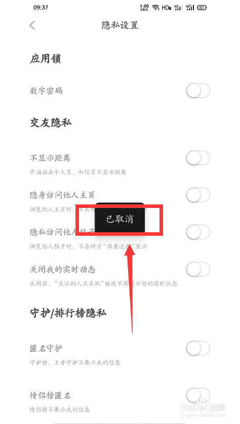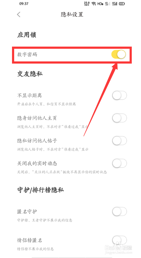 第三步:点击【数字密码】右侧的【开关头】,将其封闭
