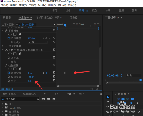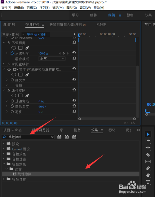 第四步,在结果里面输入【线性擦除】,双击过渡里面的线性擦除